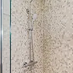 Ferieejlighed har værelser med trådløst internet, tv og strygefaciliteter. En hårtørrer og håndklæder opbevares på badeværelset.